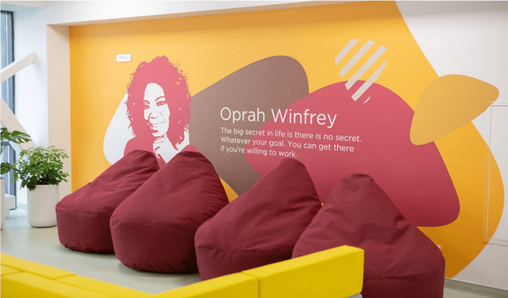 Нархоз университеті әр қабатта суретке түсіру үшін арнайы қабырға орнатты, онда түстер палитрасы білім беру бағдарламаларына сәйкес келеді. Студенттер таңдаған ұлы тұлғалардың дәйексөздері қабырғаларды безендіріп, ойлылық пен еркіндік атмосферасын жасайды.