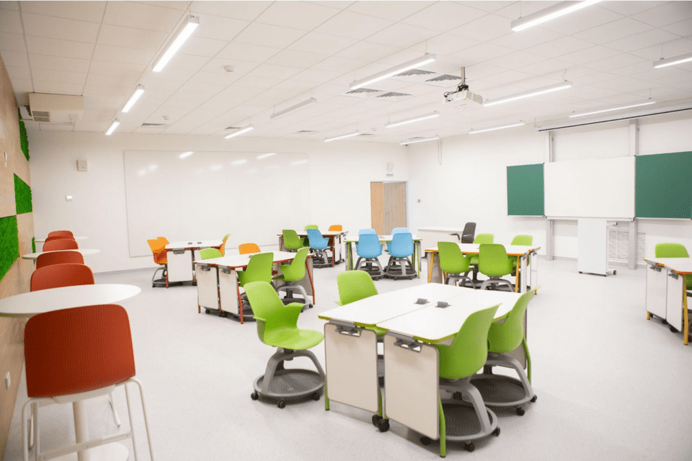 Аудиторияда экологиялық стандарттарға сәйкес келетін Steelcase заманауи жиһазы бар, сонымен қатар VS интерактивті тақтасы мен polyvision маркер тақталары бар.